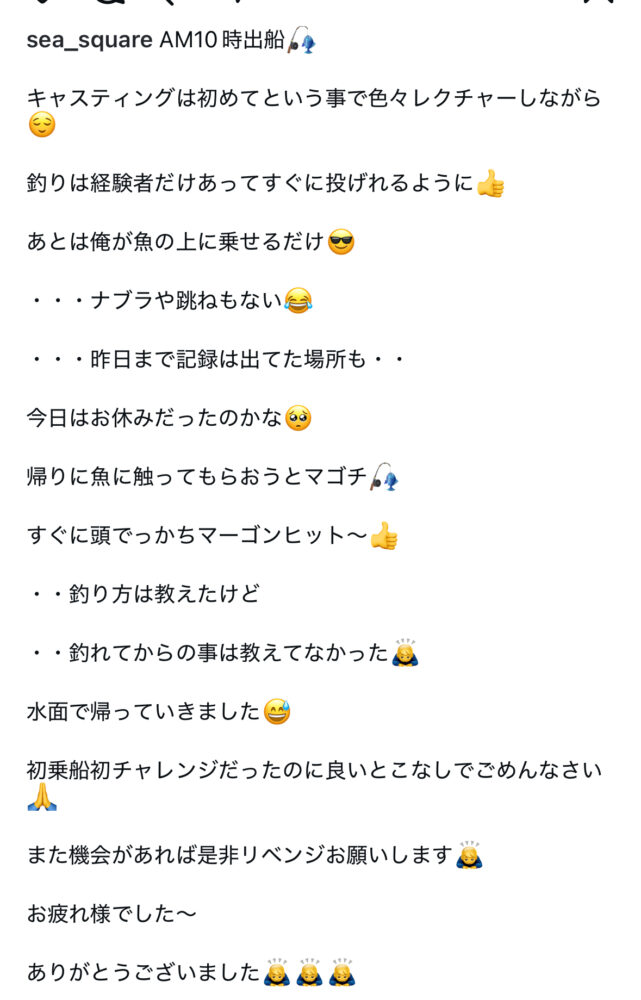 SEA SQUARE NAGOYA【シースクエア名古屋】 > 釣果情報 > お知らせ > 撃沈でした 釣果情報 お知らせ|2025.10.01 撃沈でした AM10時より🎣撃沈でした🙇♂️ 釣果情報一覧に戻る
