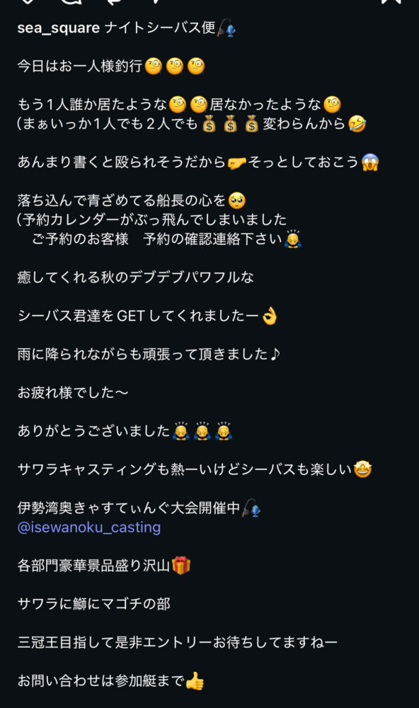 SEA SQUARE NAGOYA【シースクエア名古屋】 > 釣果情報 > お知らせ > ナイトシーバス便 釣果情報 お知らせ|2025.10.04 ナイトシーバス便 ナイトシーバス便🎣 釣果情報一覧に戻る