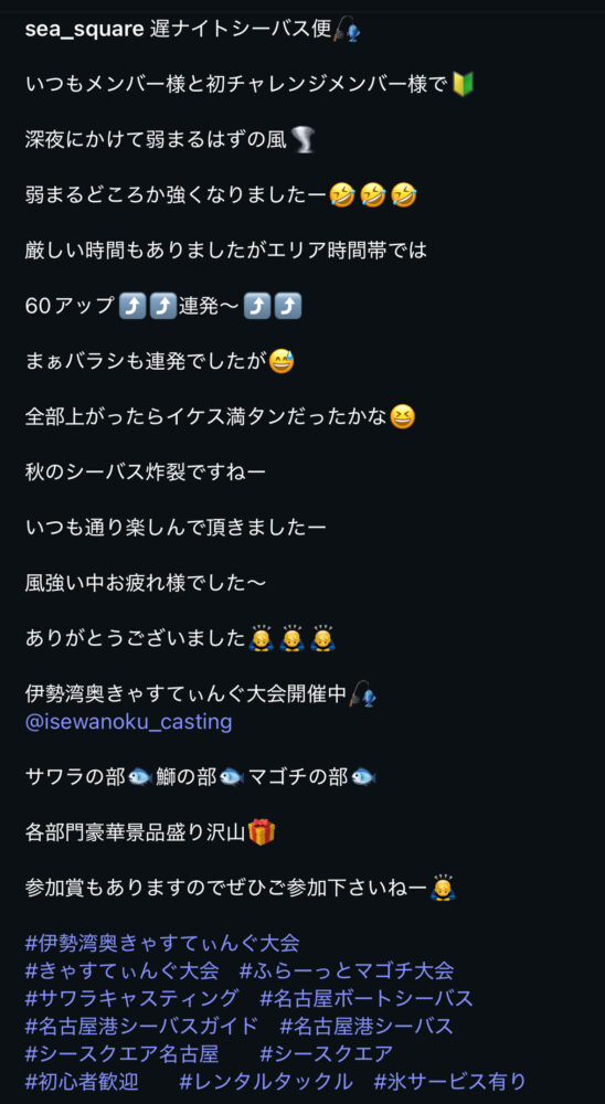 SEA SQUARE NAGOYA【シースクエア名古屋】 > 釣果情報 > お知らせ > ナイトシーバス便