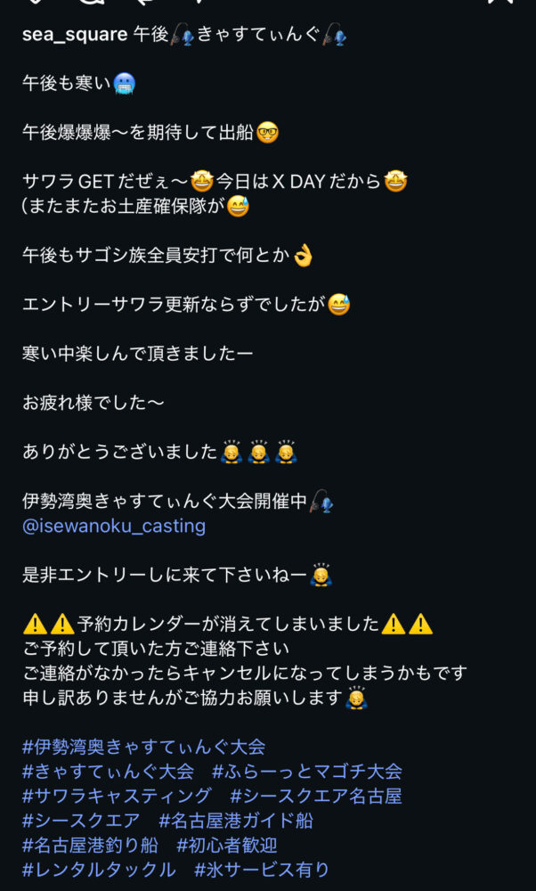 SEA SQUARE NAGOYA【シースクエア名古屋】 > 釣果情報 > お知らせ > 午後もキャスティング 釣果情報 お知らせ|2025.10.23 午後もキャスティング 午後🎣 釣果情報一覧に戻る