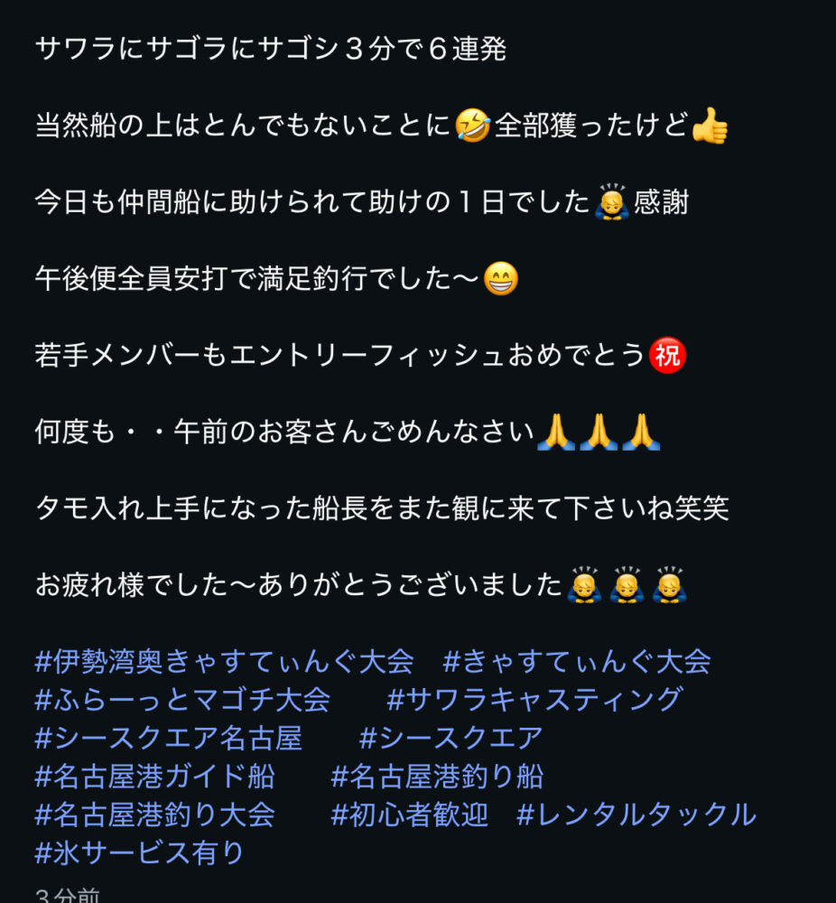 SEA SQUARE NAGOYA【シースクエア名古屋】 > 釣果情報 > お知らせ > 午後キャスティング爆爆爆 釣果情報 お知らせ|2025.11.04 午後キャスティング爆爆爆 午後キャスティング🎣爆 釣果情報一覧に戻る