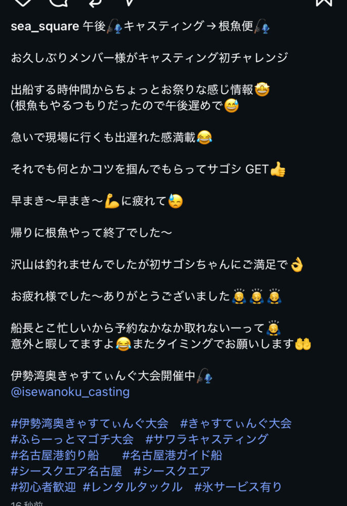 SEA SQUARE NAGOYA【シースクエア名古屋】 > 釣果情報 > お知らせ > 午後きゃすてぃんぐ便 釣果情報 お知らせ|2025.11.23 午後きゃすてぃんぐ便 午後🎣 釣果情報一覧に戻る