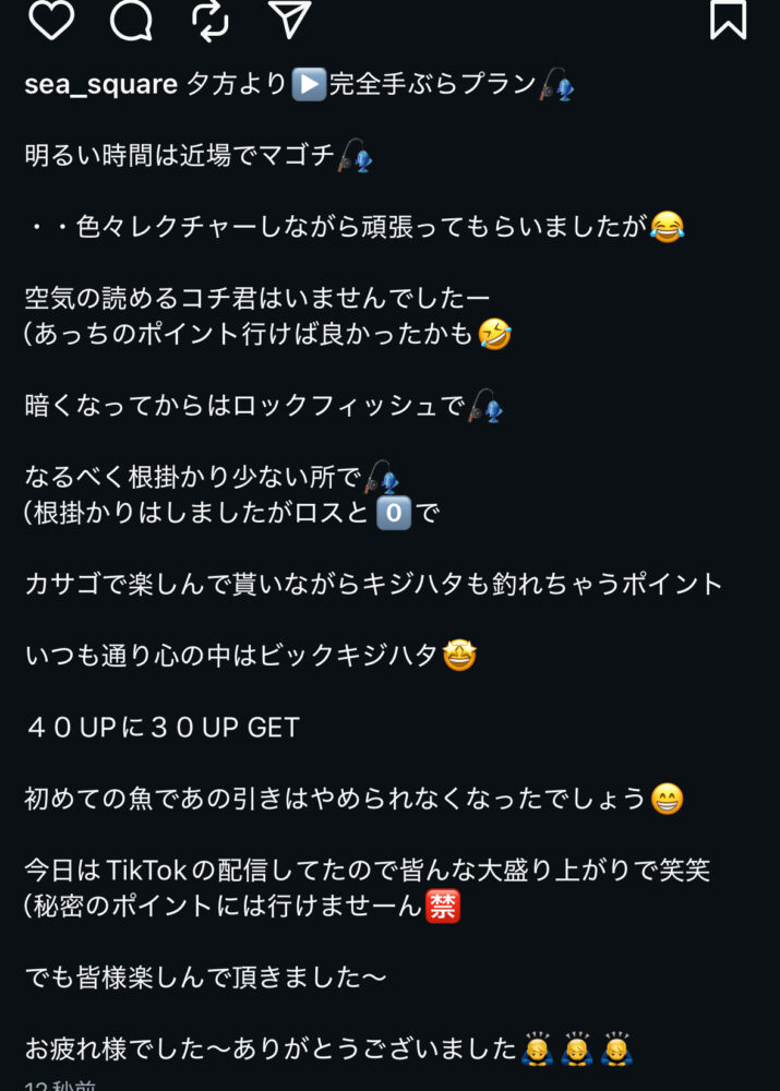 SEA SQUARE NAGOYA【シースクエア名古屋】 > 釣果情報 > お知らせ > フルレンタルタックルにて出船 釣果情報 お知らせ|2025.12.01 フルレンタルタックルにて出船 夕方より🎣 釣果情報一覧に戻る