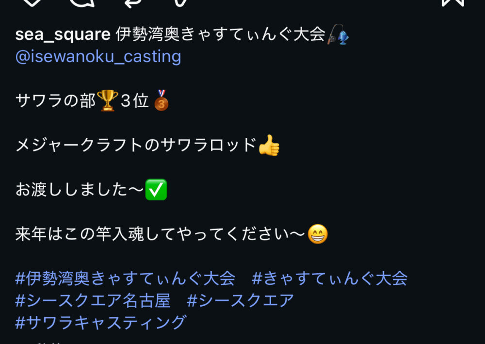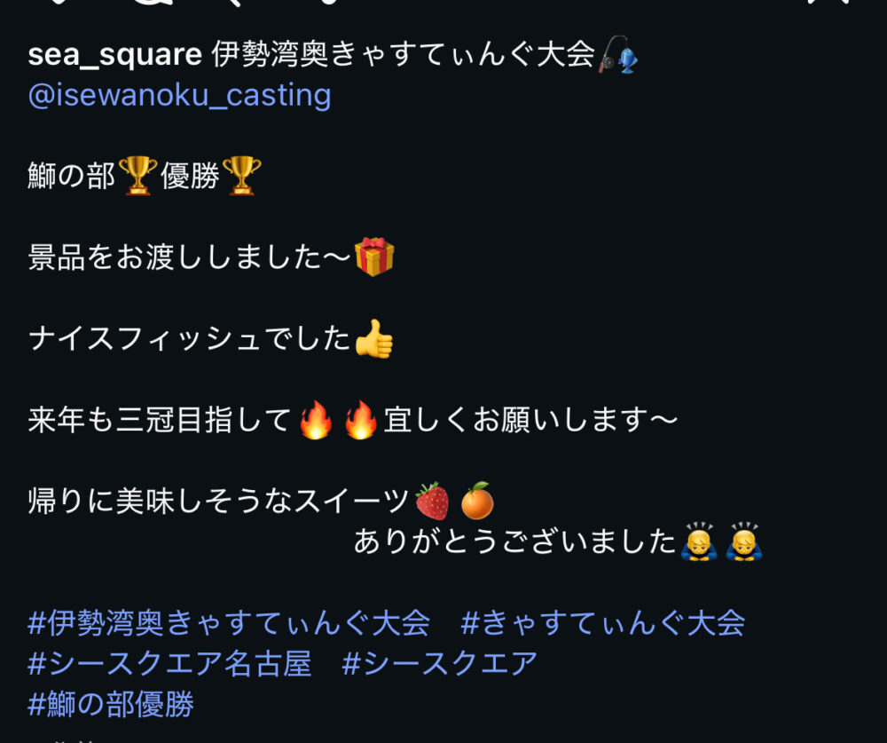 SEA SQUARE NAGOYA【シースクエア名古屋】 > 釣果情報 > お知らせ > きゃすてぃんぐ大会景品