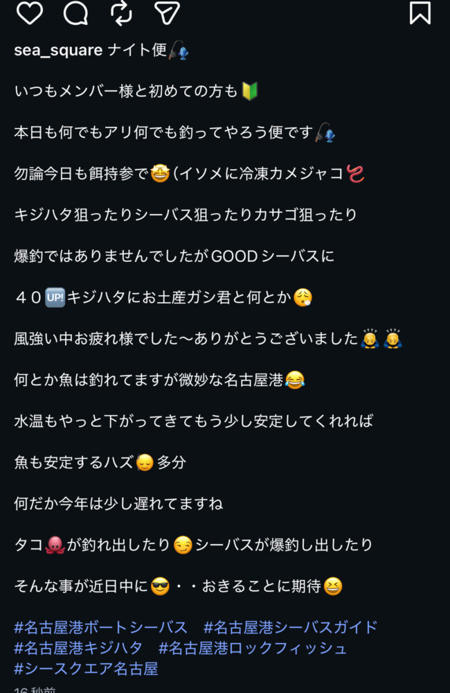 SEA SQUARE NAGOYA【シースクエア名古屋】 > 釣果情報 > お知らせ > ナイト便