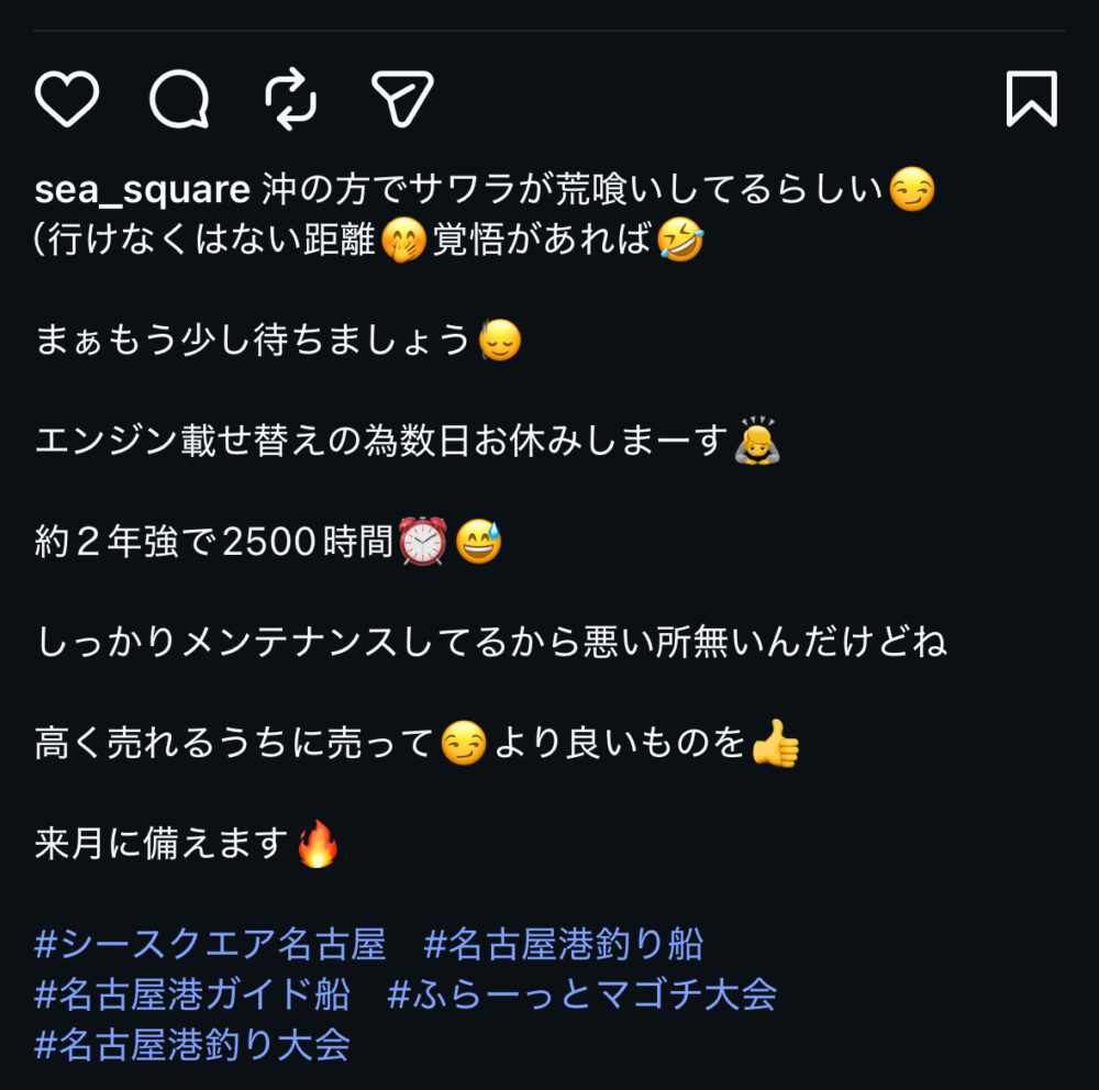 SEA SQUARE NAGOYA【シースクエア名古屋】 > 釣果情報 > お知らせ > エンジン載せ替え